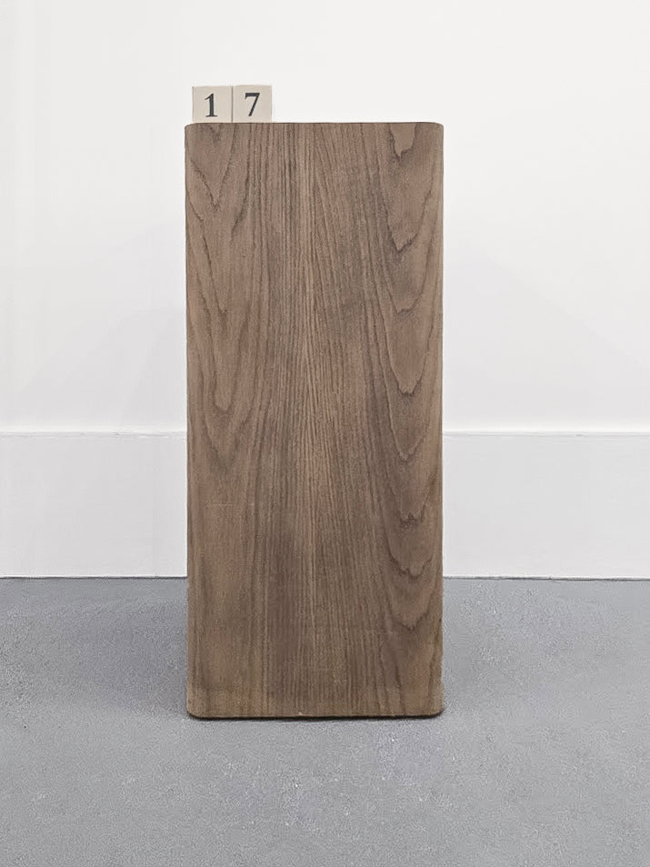 The plinth is provided by the gallery and features a natural wood textured finish with soft rounded corners. This warmer and more organic surface introduces a material and tactile presence to the exhibition, offering a gentle contrast to white gallery walls while maintaining a refined and professional presentation.